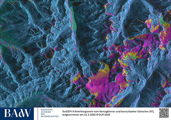 Das Bild zeigt eine Zwischenstufe in der Auswertung von Radardaten der deutschen Satellitenmission TanDEM-X zur Bestimmung eines digitalen Höhenmodells. Zu sehen ist der Vernagtferner und benachbarte Gletscher im Ötztal, Österreich, rechts der Bildmitte in Gelb- und Magentatönen. Die Farben geben die Differenz der Oberflächenhöhe zum Zeitpunkt der Aufnahme gegenüber einem Referenzhöhenmodell (COPERNICUS DEM) an. Dadurch werden stabile Bereiche in blau, die Gletscher durch die Eisabnahme in wärmeren Farben dargestellt. Eine Skalierung in Höhenänderungen erfolgt in der hier genutzten Gamma-Software im nächsten Schritt. Die Höhenabnahme im Bereich der Gletscherzungen beträgt hier bis zu -4 m pro Jahr.