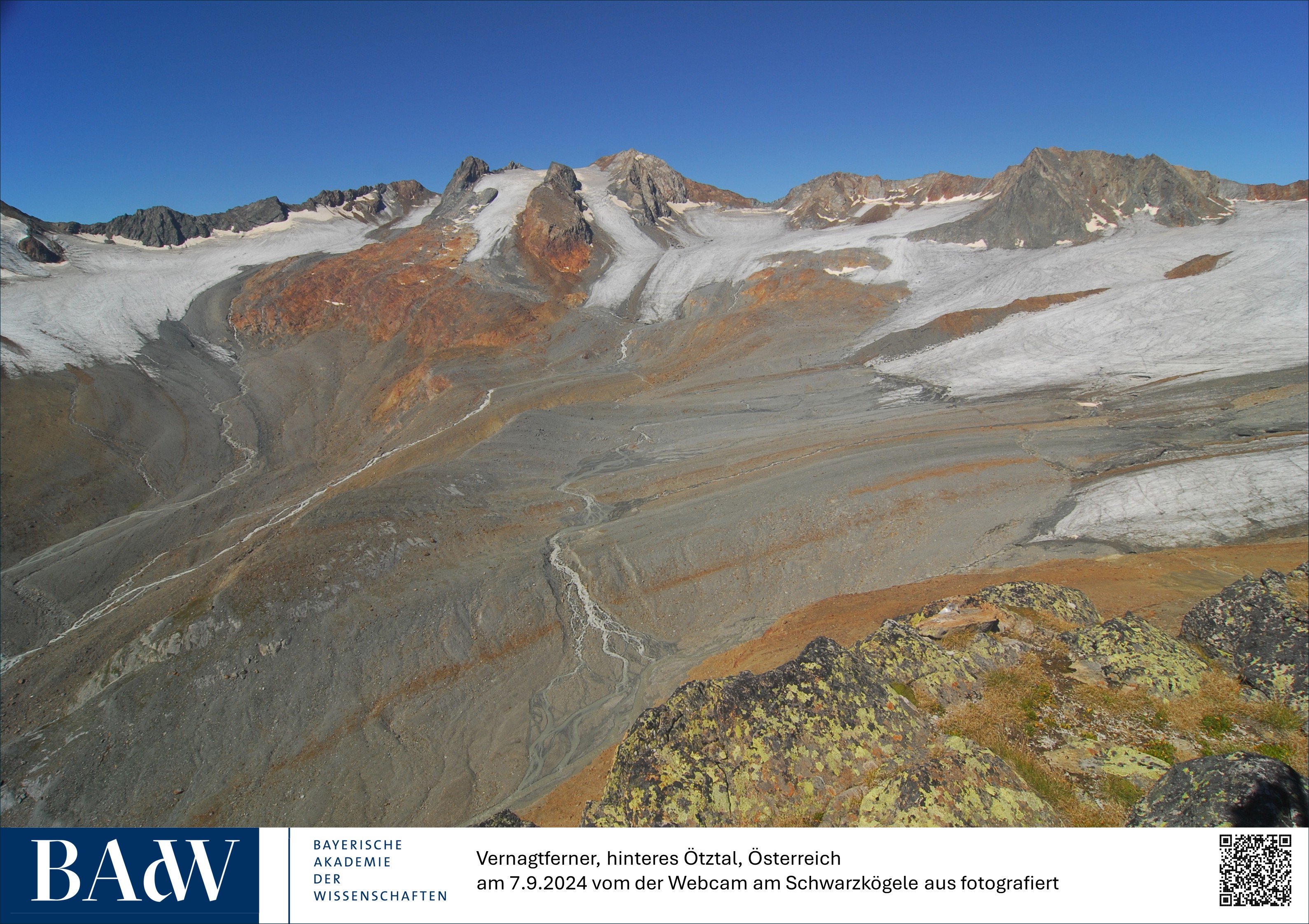 Dieses Foto wurde am 7. September 2024 zur Mittagszeit von der automatischen Kamera am Schwarzkögele aufgenommen. Seit 2010 fotografiert die Kamera mehrfach täglich den Gletscher. Das Bild zeigt den Gletscher am Ende der Schmelzperiode, also mit minimaler Schneedecke. In diesem Jahr, wie auch den beiden vorangegangenen, überdauerte praktisch kein Winterschnee den ganzen Sommer. Damit ist die gesamte Gletscherfläche dem Ablationsgebiet zuzurechnen, in dem die Schmelze (Ablation) größer ist als der Schneefall (Akkumation). Die Gleichgewichtslinie, die gedachte Linie, die auf einem „gesunden“ Gletscher beide Gebiete trennt, lag also oberhalb des Gletschers. Seit 1964 werden diese und weitere Parameter zur Massenbilanz des Vernagtferners von der BAdW erfasst und sind auf unserer Internetseite zu finden.